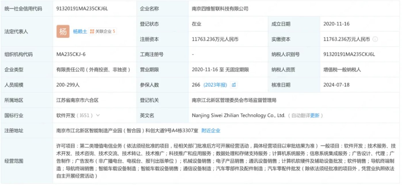 2021 年,经过南京江北新区投资,成立南京四维智联科技有限公司。