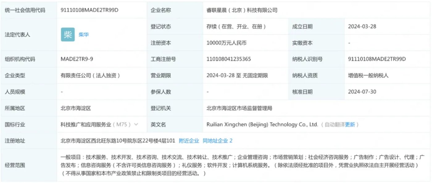睿联星晨为滴滴旗下智能座舱相关资产。企查查数据显示,睿联星晨成立于 2024 年 3 月 28 日,是一家以从事科技推广和应用服务业为主的企业;7 月 30 日,睿联星晨注册资本从 100 万元变更为 1 亿元。