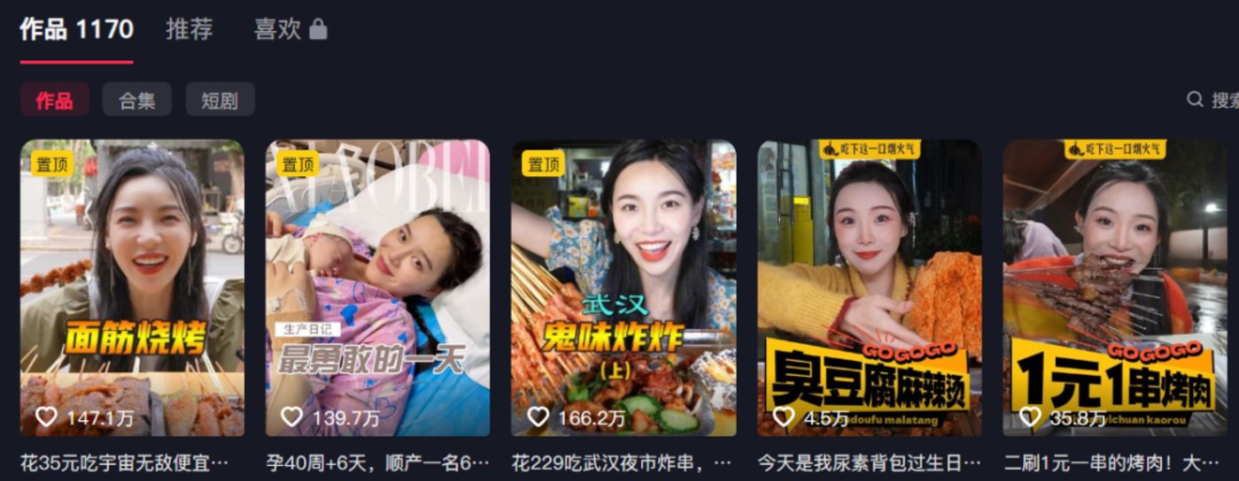 又比如在抖音平台以 「吃播」 为关键词搜索,粉丝量最高的 「小贝饿了」,其粉丝高达 1664 万,获赞 2 亿。而浏览她的主页可以看到,除了日常的吃播视频,她的小号还包括了 「带娃」「健身」「好物」「故事」「综艺」 等不同的分类。