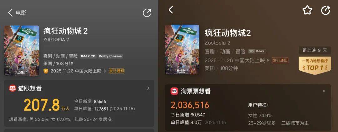 截至目前,影片在猫眼取得了超过 200 万+的想看人数,位列历史第三的位置,仅次于今年另一部现象级作品 《731》 以及 《唐人街探案 3》。同时,影片超越 《复仇者联盟 4》 同样也是一大壮举,预示着 《疯狂动物城 2》 成为有史以来,最受期待的好莱坞电影。另一边,淘票票同样也成功拿到了 200 万+的想看人数。