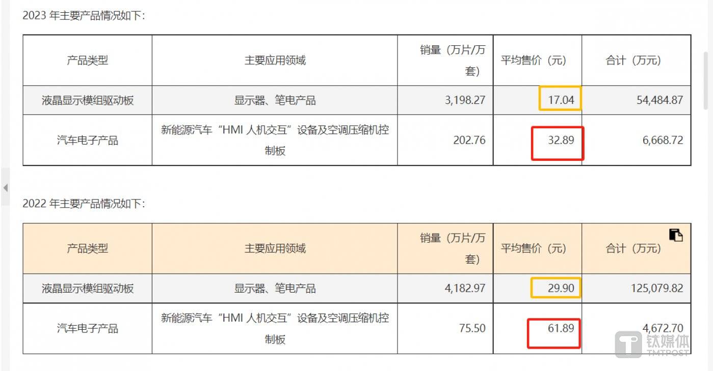不过,由于公司液晶显示板块规模减少、汽车电子行业需求增长,公司向汽车电子领域拓展,同行业的公司亦向汽车电子产品生产加工转型,市场竞争日趋激烈,客户在需求更好的服务过程中对成本压降要求提高;另 2023 年公司汽车电子原重要客户博泰车联网科技 (上海) 股份有限公司将加工订单从公司逐步转移到自身生产基地,对公司需求减少。故公司产品结构调整市场未达预期。