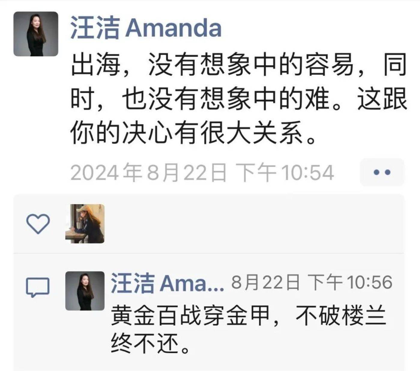 紧接着汪洁在评论区补充了一句:「黄金百战穿金甲,不破楼兰终不还。」