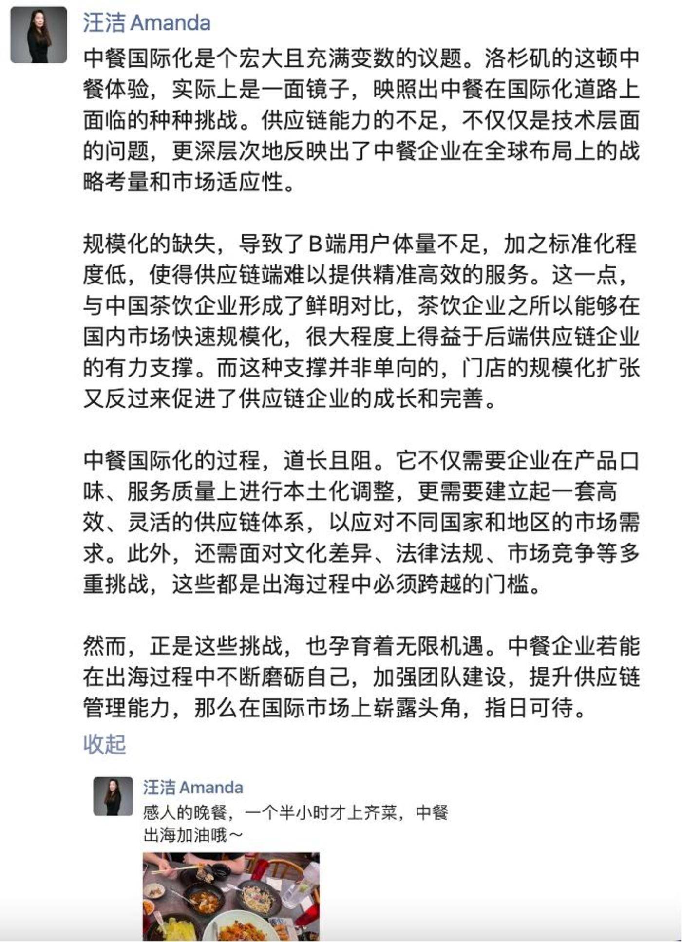 「感人的晚餐,一个半小时才上齐菜,中餐出海加油哦!中餐国际化是个宏大且充满变数的议题,洛杉矶这顿中餐体验,实际上是一面镜子,映照出中餐在国际化道路上面临的种种挑战.... 我们需要建立起一套高效、灵活的供应链体系,提升供应链的管理能力....」