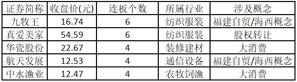 从连板情况来看,今日首板个股有 39 只;2 连板的个股有 7 只;3 连板及以上的个股有 8 只。今日连板数排名前 5 的个股包括九牧王、真爱美家、华瓷股份、航天发展、中水渔业,具体如下表所示。