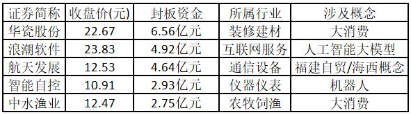 从封板资金来看,今日涨停板个股中,封板资金排名前 5 的个股包括华瓷股份、浪潮软件、航天发展、智能自控、中水渔业。