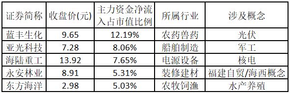 主力资金净流入金额占市值比例排名前 5 的个股分别为蓝丰生化、亚光科技、海陆重工、永安林业、东方海洋。