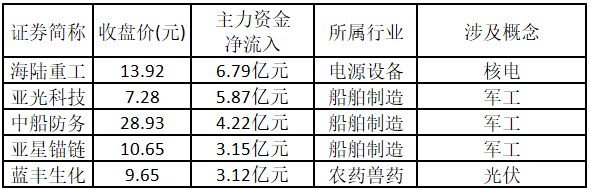 从主力资金来看,今日主力资金净流入金额排名前 5 的涨停股中,有 3 只属于军工股,且均为船舶制造行业,另外两只则涉及能源。