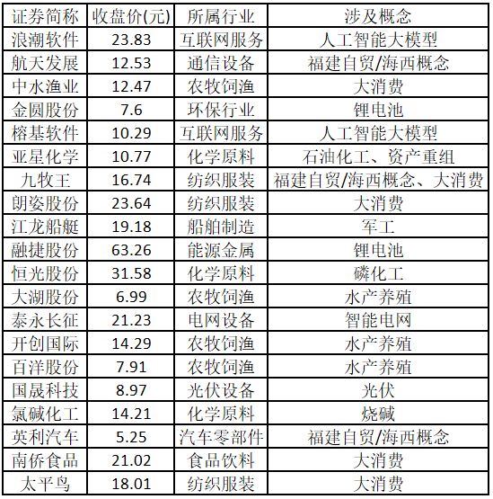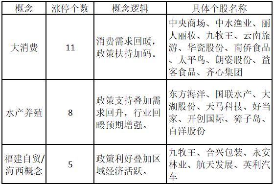 从概念特征来看,今日涨停板个股中,大消费、水产养殖、福建自贸/海西概念的个股最多。