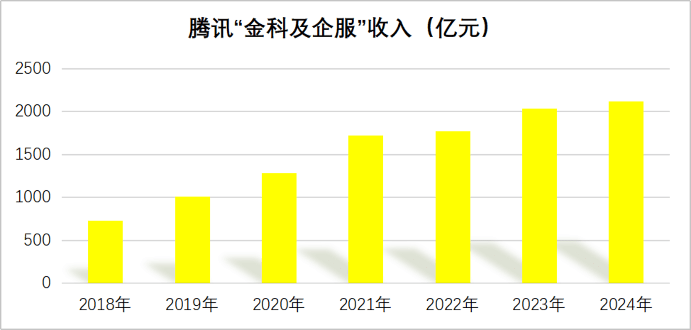 财报显示,2018 年-2024 年,「金科及企服」 收入从 731.38 亿元膨胀到 2119.56 亿元,期间复合增速接近 20%,营收占比从 20% 多显著抬升到 30%+,成为仅次于增值服务 (游戏、社交、会员) 的第二支柱,也是驱动中年腾讯上行生长的强大引擎。