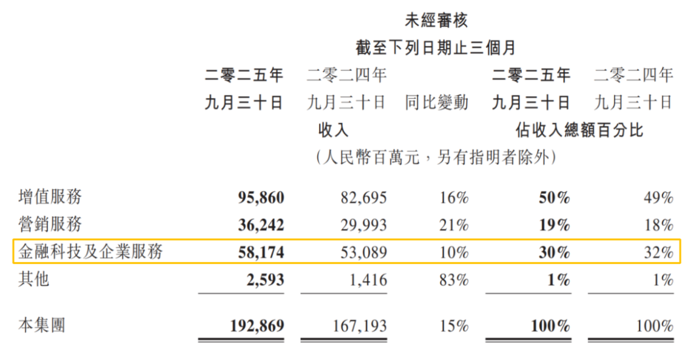 其中,金融科技及企业服务 (以下简称 「金科及企服」) 板块实现收入 581.74 亿元,同比提升 10%,贡献了营收的三成。