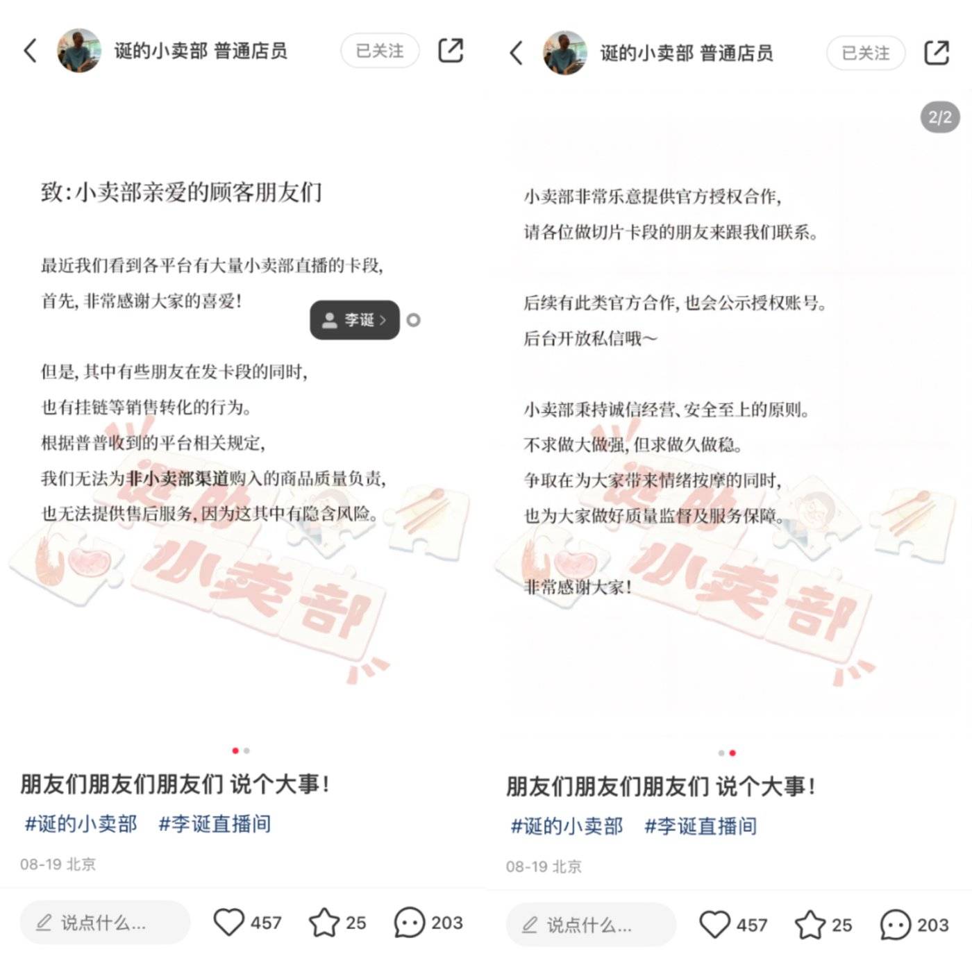 为此,8 月 19 日,@诞的小卖部 普通店员 还专门发了小红书,说乐意提供官方授权合作,请做切片片段的朋友与我们联系。