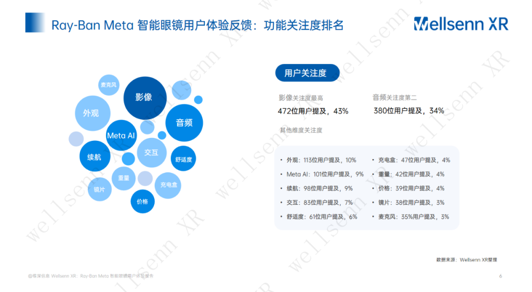 wellsenn XR 的用户调研数据显示,关注度最高的前三功能为影像 (43%)、音频 (34%) 和外观 (10%)。