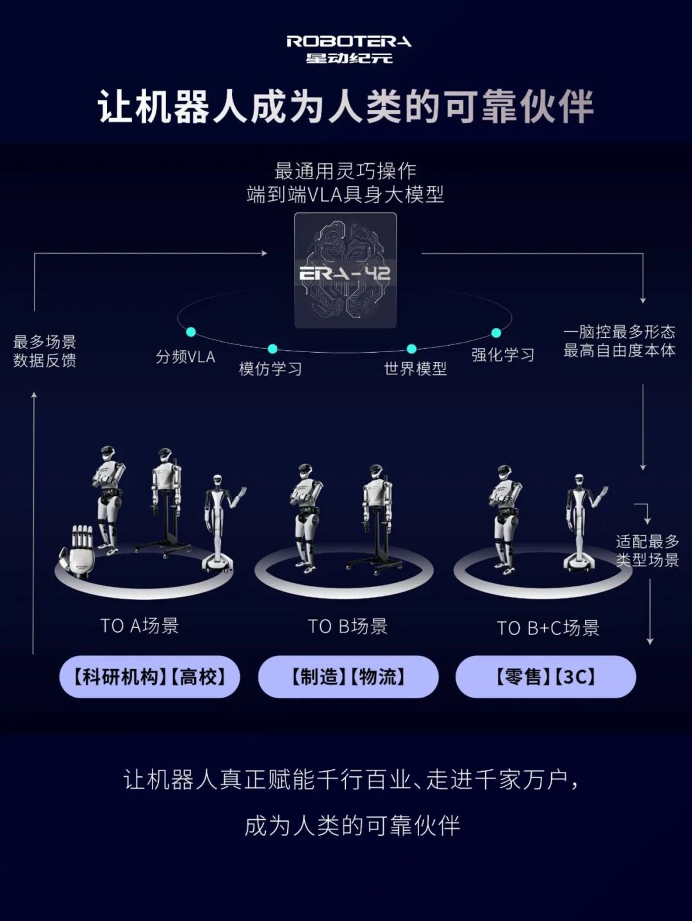 具身大脑 ERA-42 已在物流、制造、商业服务等多个领域落地,形成了 「场景越丰富,模型越智能」 的正向循环。在物流领域,可完成药品、日化品、包裹的分拣及扫码;在制造领域,重点突破 「零部件抓取 - 高精度装配 - 质量检测」 等场景任务;在商业服务领域,可完成门店客座清洁、物品递送、导游导览等。其中,部分场景效率当前达到 70%。