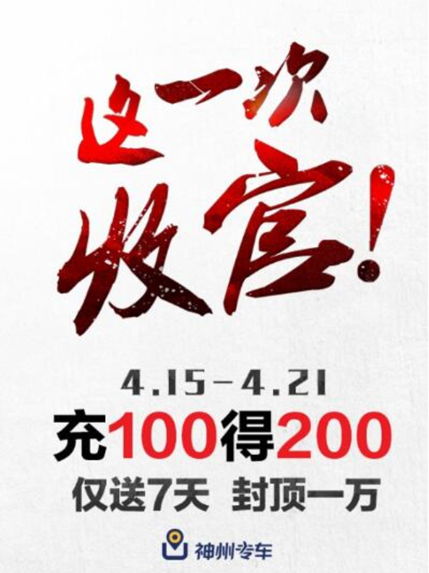 此后神州专车发起 「充 100 送 100」 大促活动,相当于五折,而同时期快的一号专车新用户邦迪信用卡奖励金额为 60 元,滴滴专车券金额在 20 元左右.