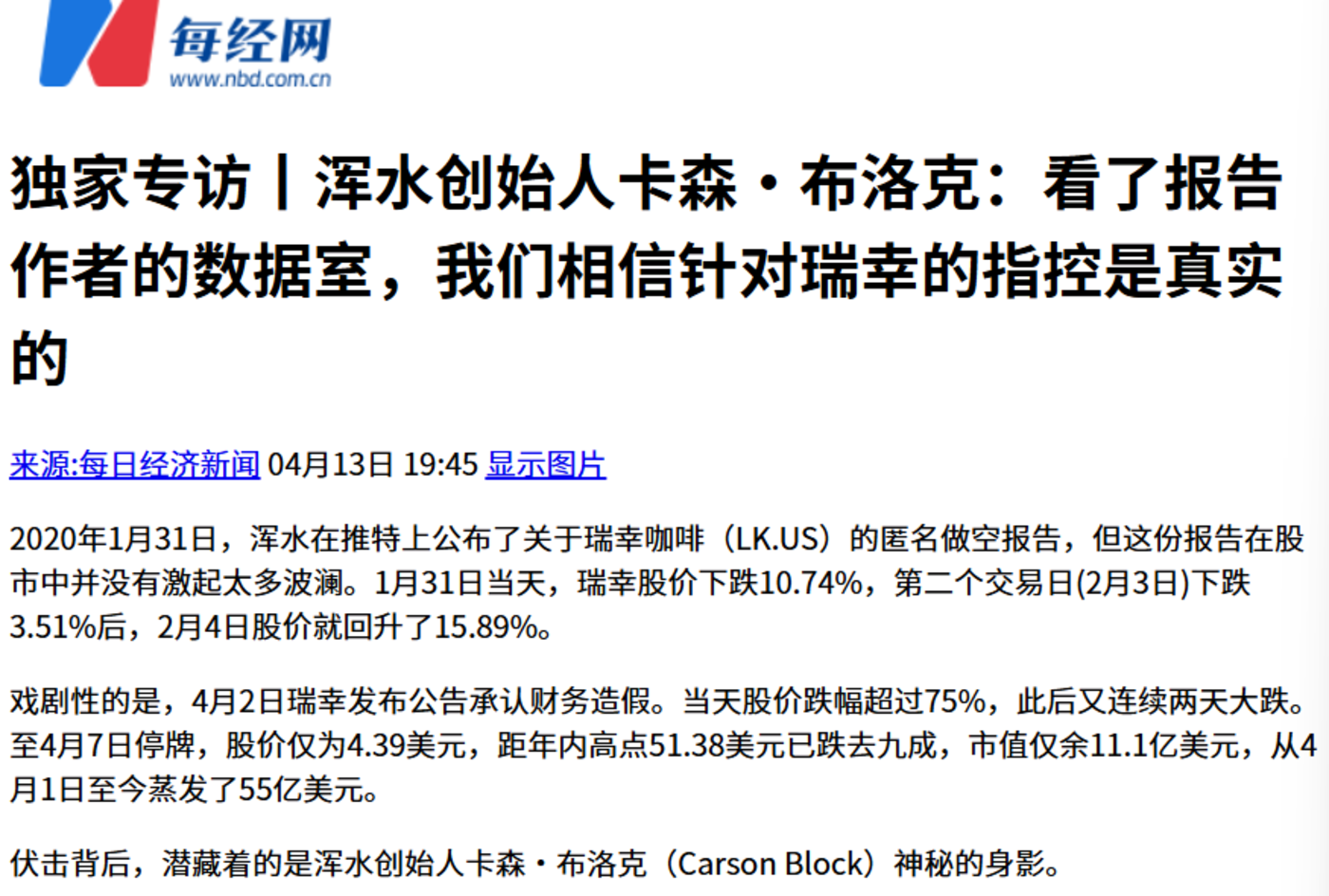 2020 年 1 月,做空机构浑水公司 92 个全职和 1400 个兼职调查员,收集了 25000 多张小票,进行了 10000 个小时的门店录像,收集了大量内部微信聊天记录,形成了一份针对瑞幸的做空报告: