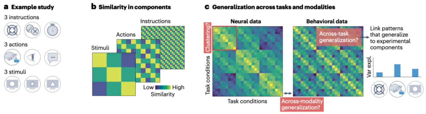 ▷图 b:量化任务需求影响的示例方法。a, 在一个示例研究中,研究者变化了多个实验组件 (包括指令、提示动作和刺激),总共设置了 27 个不同的任务条件。通过变化实验组件,研究者间接地操纵了任务需求。b, 分析实验组件内不同任务条件之间的相似性。c, 进行泛化分析。矩阵显示了行为数据 (例如,触须运动的相似性) 或神经数据 (例如,感兴趣区域的神经模式相似性) 在不同任务条件下的泛化分数。箭头和方框指示了量化任务需求影响的示例分析步骤。首先,通过聚类分析可以揭示哪些任务引发了相似的行为和神经环路。其次,通过测试跨任务的泛化 (例如,可解码性、编码模型性能和表示相似性分析),可以发现有意义的模式。第三,通过寻找在行为和神经数据之间泛化的模式,可以揭示大脑与行为之间的关系。最后,通过将这些泛化的数据模式与实验组件联系起来,可以形成新的概念。