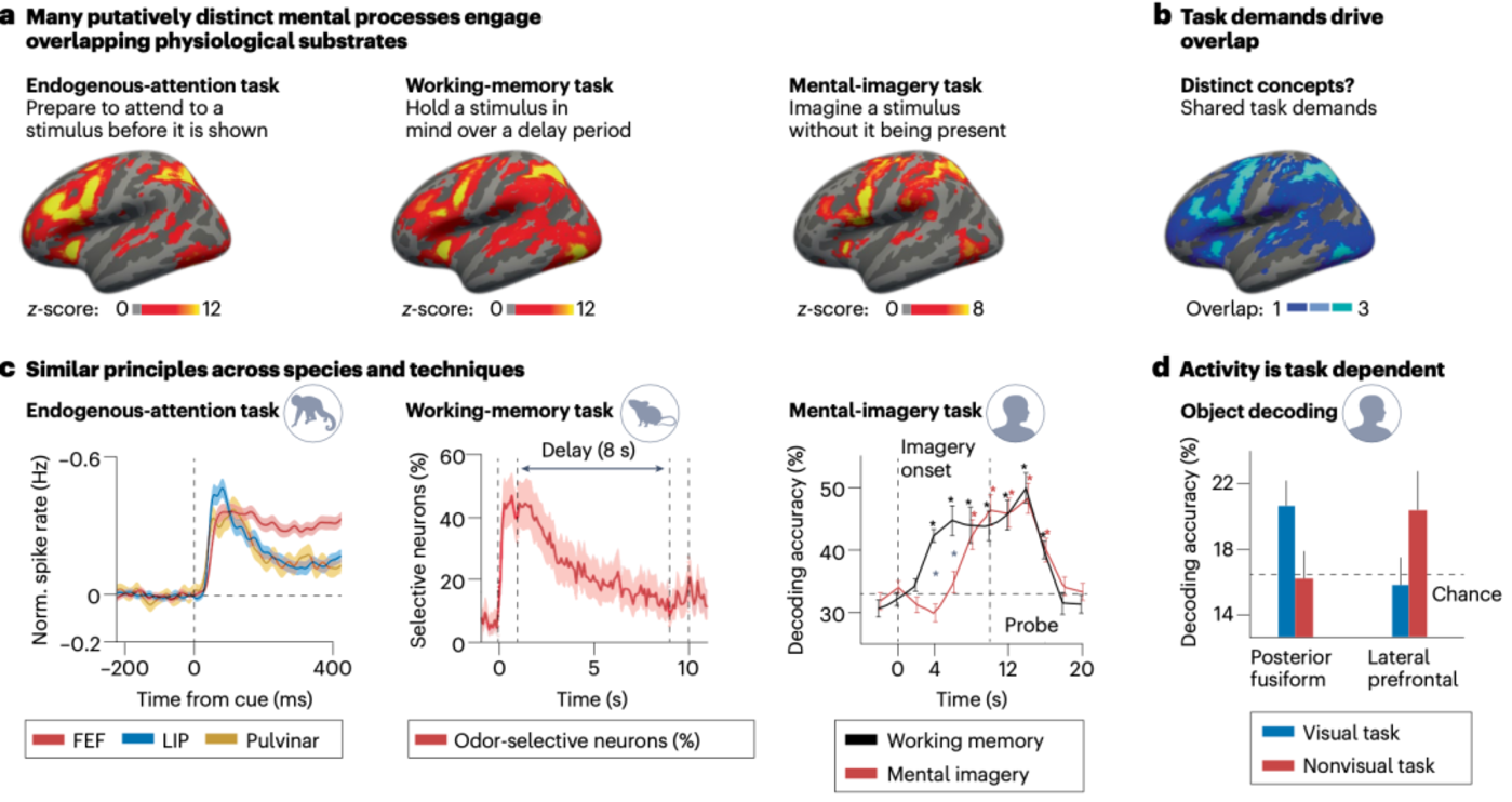 ▷图 a:共享的任务需求促进了不同领域间的相似性。a, 被认为是不同的心理过程实际上激活了部分重叠的生理基础。这些通常通过特定任务来研究的示例概念包括 「注意力」、「工作记忆」 和 「意象」。表面上。需要注意的是,这些统计图可能掩盖了个体在活动强度和定位上的差异。b, 共同的任务需求很可能解释了在不同心理概念之间观察到的神经环路重叠现象。我们展示了 a 中统计图的叠加区域,其中亮蓝色区域表示这三个示例概念共同激活的大脑区域。c, 一些研究报道了跨物种和技术的相似原则。例如,当预期目标出现在感受野时,猕猴的神经元在提示-目标延迟期间放电增加 [66]。小鼠的神经元在延迟期间对特定气味表现出选择性 [67]。在执行工作记忆和心智意象任务时,可以从早期视觉区域解码刺激身份 [73]。FEF,前额眼区;LIP,侧内顶叶区。d, 一项研究显示,神经环路与任务类型有关。后梭状回皮层和侧前额叶皮层对物体身份的解码能力取决于所执行的任务 [70]。
