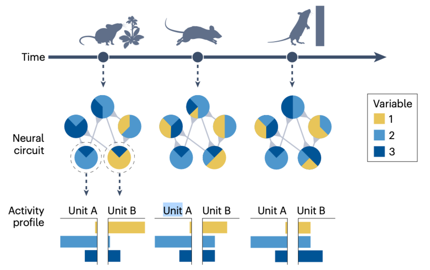 ▷图 2:神经回路之间的相互连接产生了支持心理和行为灵活性的活动动态。顶部,目标、行为和环境感知随时间相互依赖地变化。例如,老鼠会根据自己即时的状态 (吃食、奔跑或攀爬) 而优先关注环境的不同方面。中间,神经回路的示意图展示了五个示例单元,每个单元可能代表一个单独的神经元或局部神经元群体。每个单元同时编码多个变量 (例如,混合选择性,如颜色、头部方向和视觉流),这取决于能动者试图完成的行为 (例如,在奔跑和攀爬时,姿势可能解释一个单元的活动,但在吃食时则不会)。底部,展示了两个示例单元的活动轮廓 (例如,两个神经元或两个神经群体的尖峰列车解释的方差)。单元 A 的活动轮廓在行为状态之间泛化,而单元 B 的则不会。然而,在单元 B 内,某些元素确实在状态之间泛化 (例如,由变量 1 和 3 解释的方差部分)。为了发现每个状态独特的原则,以及所有状态共有的原则,必须跟踪大量的感觉和行为变量,并将它们与神经活动联系起来。此外,因为每个单元的活动取决于其他单元的活动,所以需要进行大规模的神经记录和网络级别的调查。最后,混合选择性和其任务依赖性表明,神经回路不仅仅有一个功能,而是有多个功能,这些功能只能在任务的背景下定义。