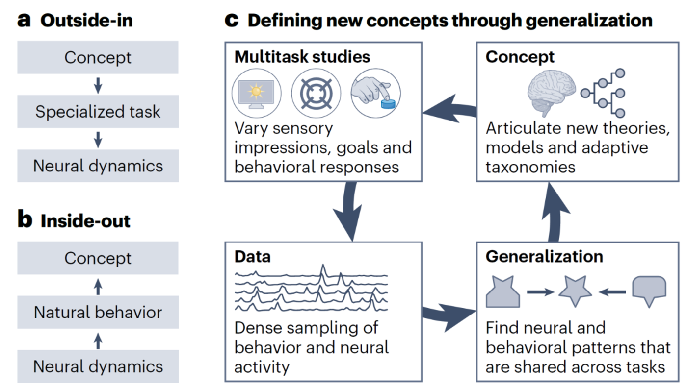 ▷图 3:任务需求连接心理概念与数据。a, 外部进入方法。预定义的心理概念通过使用高度专门化的任务 (例如,工作记忆任务) 映射到神经数据上。无法发现新概念。b, 内部输出方法。在自然行为过程中记录的神经动态映射到行动和环境因素上。可以发现新概念,但映射不唯一,搜索空间受限。c, 通过概括定义新概念。左上,多任务研究通过变化多个实验组件 (即感官信息、目标和行为) 系统地变化任务需求。左下,结合神经记录和行为追踪的多任务实验创建了旨在利用变异性同时保持实验控制的数据集。右下,概括性测试识别在不同任务及行为和神经数据间共享的数据模式。右上,可以描述、标记并组织成新的分类法的泛化模式,随后指导实验设计。