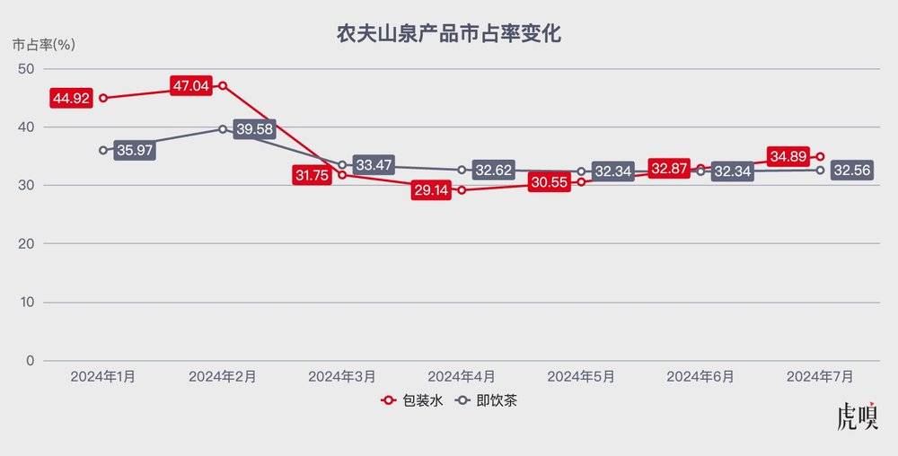 根据马上赢数据,农夫山泉包装水在包装水市场的市场份额在今年上半年经历了较大波动。今年 2 月,农夫山泉包装水的市占率达到 47.04%,而 4 月滑落至 29.14%,7 月份恢复至 34.89%。