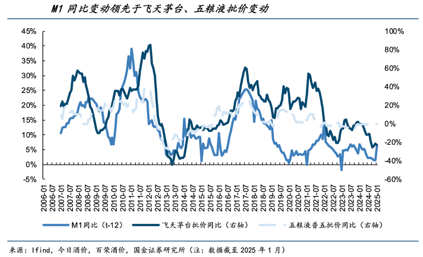 国金证券发现 M1 同比增速是相对前瞻的飞天茅台批价变动指标。且 M1 同比增速领先飞天茅台批价变动约 6~18 个月,主要系 M1 反映了短期流动性水平,流动性宽松一方面通过提升经济活跃度、带动企业和居民端消费;另一方面,通过资产升值的财富效应间接推动白酒消费,领先时间的差异也对应了各时期政策落地生效斜率具备差异。