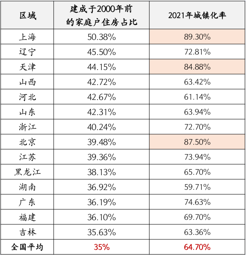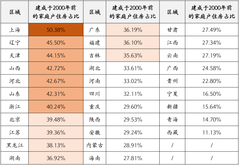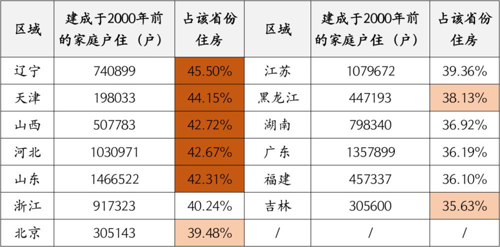 前面我们提到截止到 2020 年,按照住房建成时间划分,全国建于 2000 年前的家庭户住房一共约 1600 万户,全国平均占比 35%。