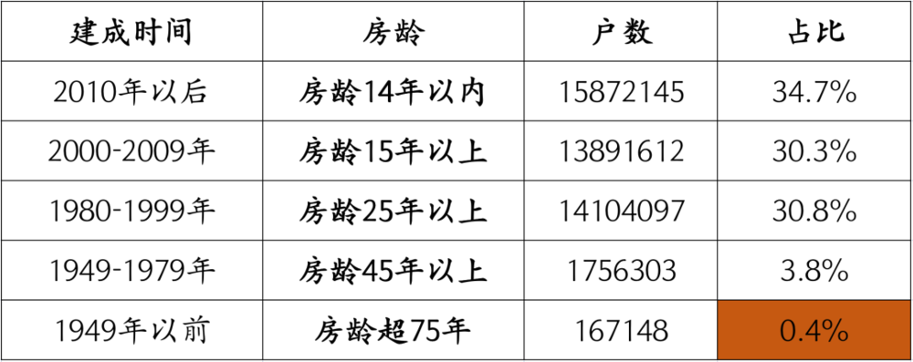 而当我根据 《中国人口普查年鉴-2020》,发现把全国 45791305 户居民按住房建成时间分的家庭户住房状况中,2000 年前修建的房屋占比高达 35%,也就是 1600 多万户。