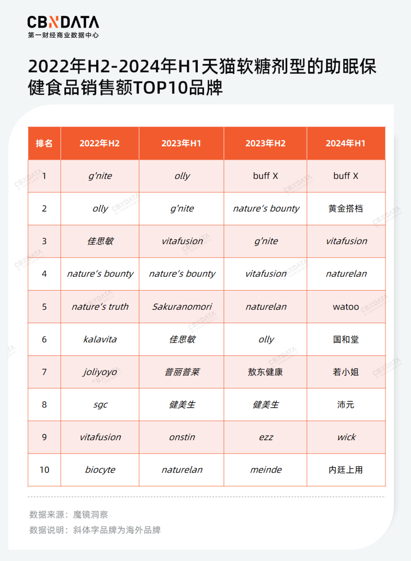 近几年,一些 「新品牌」 凭借 「轻养生」 的浪潮获得了出头的机会。以软糖剂型的助眠保健食品为例,过去,软糖类的助眠保健品主要以海外品牌为主,而如今,越来越多的国货品牌成功上榜。其中,成立于 2020 年的 buff X 更是在去年下半年直接冲上榜首,并在今年下半年依旧是软糖剂型助眠保健品销售额最高的品牌。