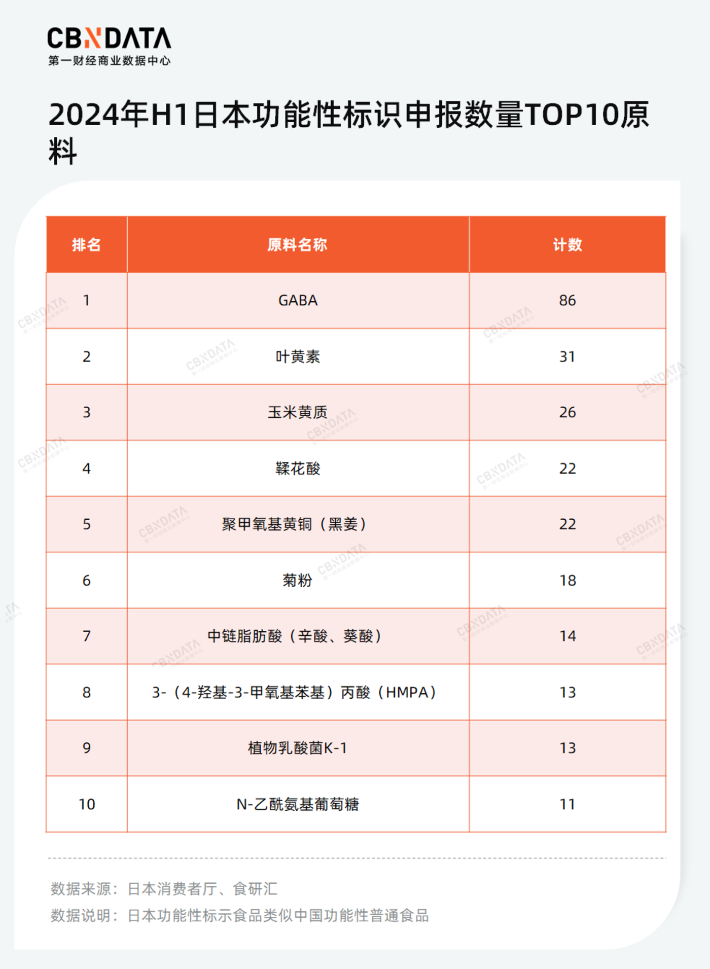 而助眠是 FFC 食品行业具有高增长的品类之一。数据显示,2023 年,睡眠相关 FFC 食品增速约 50%,规模达到约 800 亿日元,此后预计仍以 10% 以上的速度增长。连带着 GABA 在日本也备受欢迎。据食研汇统计,今年上半年日本申报的功能性食品中,GABA 是申报数量最多的原料,其申报数量远超第二名的叶黄素。