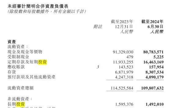 通过理想截止至 2024 年年中的合并资产负债表,能明显地看到理想的现金大幅减少,从 2023 年年底的 913.29 亿元减少至 807.84 亿元,直接减少了 105.45 亿元。与此同时,定期存款及短期投资从 119.33 亿元上涨至 164.63 亿元,增加了 45.3 亿元。