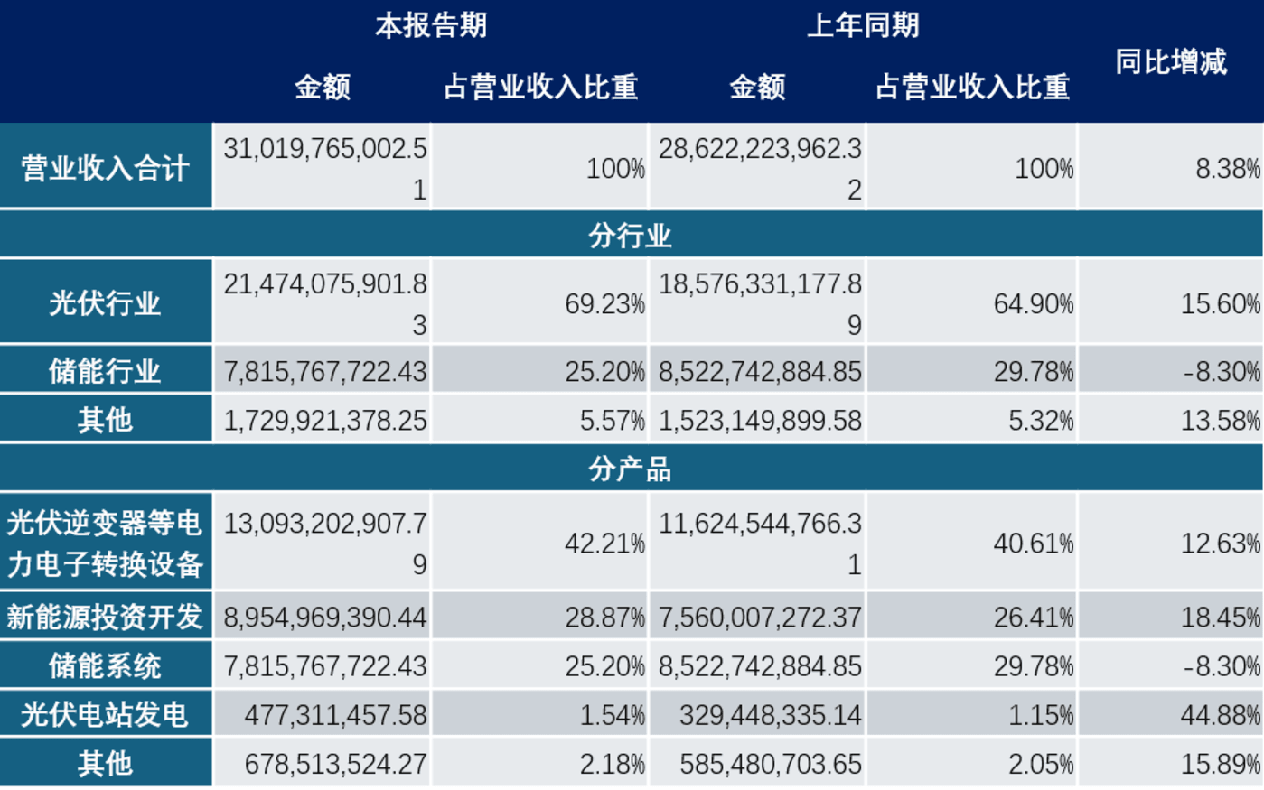 从行业来看,今年上半年储能行业的总营收同比下降;从产品来看,储能系统的营收也同比下降。这些数据似乎在说明,光伏逆变器的增长,对阳光电源的营收贡献更大。