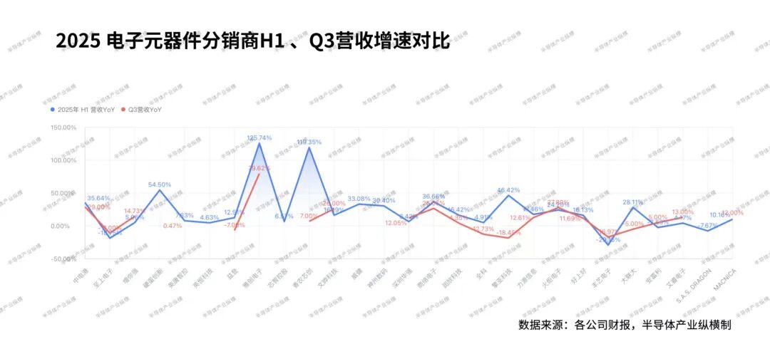 对比 2025 年上半年与 Q3 的营收增速可以发现,大部分公司在 Q3 的营收增速都低于上半年,甚至出现了负增长的情况。据业内人士向半导体产业纵横表示,下半年的增速下滑主要来自三个方面:首先,上半年 AI 带动的快速增长已经放缓,因此相关产品营收不会再复刻上半年的繁荣;其次,存储的大规模涨价,给分销商经营成本带来了压力,同时也让客户订单相应降低;最后,国内市场上,由于国补的收缩,消费电子相关订单会逐步减少,也减缓了下半年的增长。