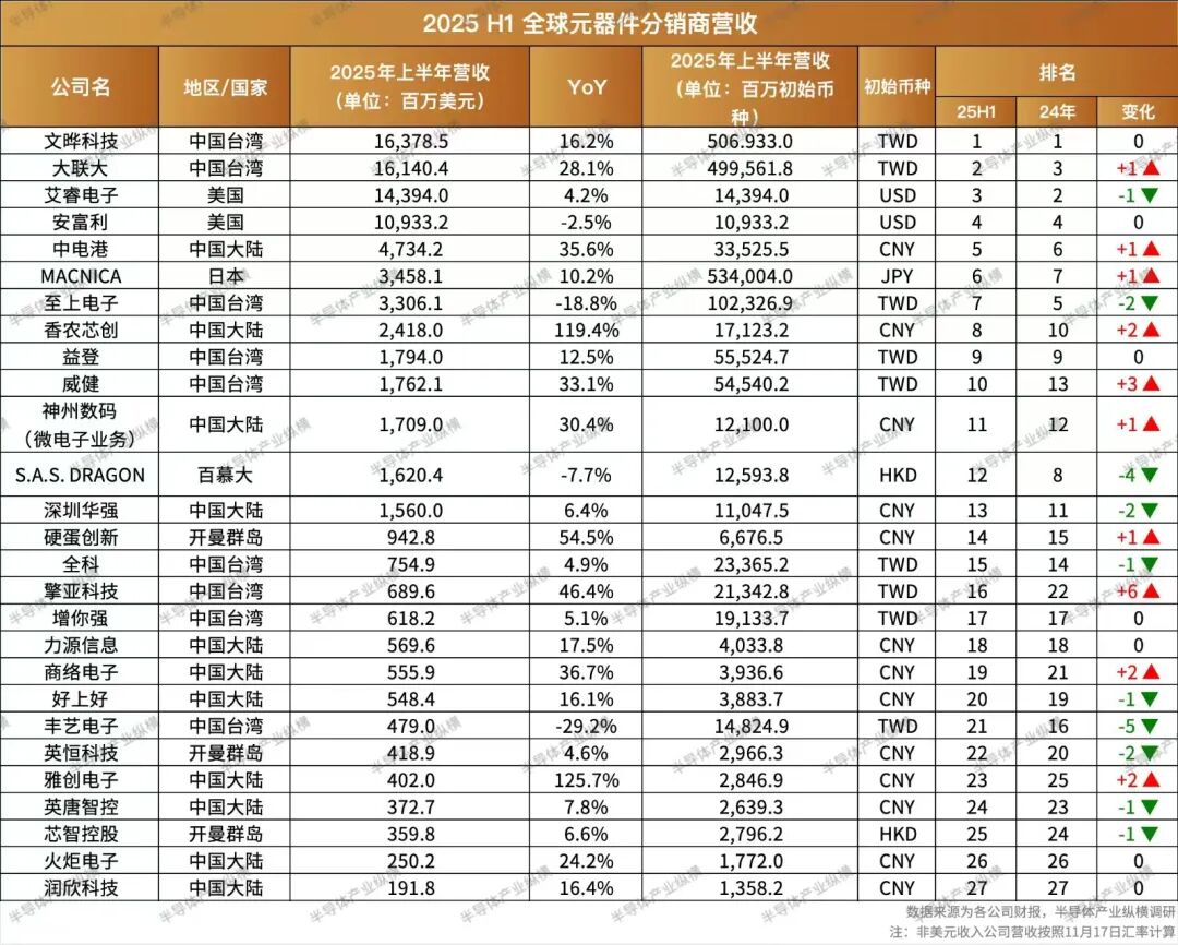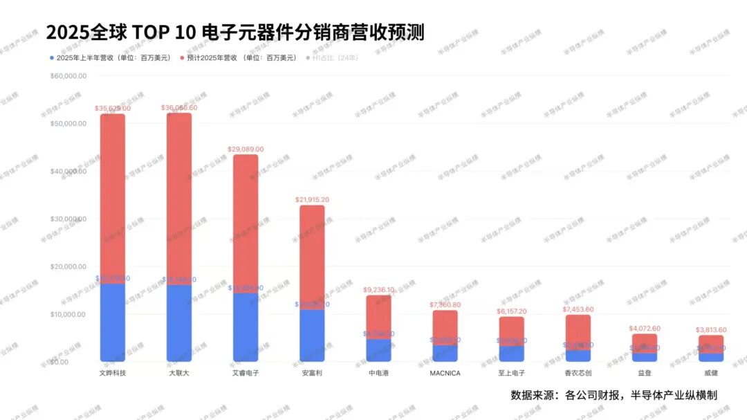 根据世界半导体贸易统计组织 (WSTS) 的统计数据,2025 年上半年,全球半导体销售额为 3,432 亿美元,同比增长 20.30%;半导体产业纵横对 27 家公司财报调研后发现,全球主要的分销商上半年销售总和为 873.6 亿美元,约占四分之一。