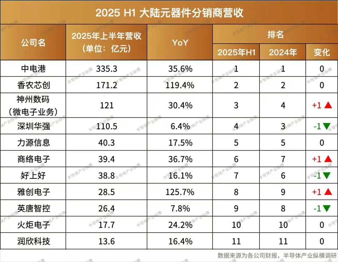 值得欣喜的是,2025 年上半年中国大陆头部分销商全部实现了营收增长。同时,中国大陆分销商正在提高国内市场占有率,2025 年上半年中国大陆的分销商营收总额在本次统计中占比 15.2%,而这一数据在 2024 年上半年为 12.3%。