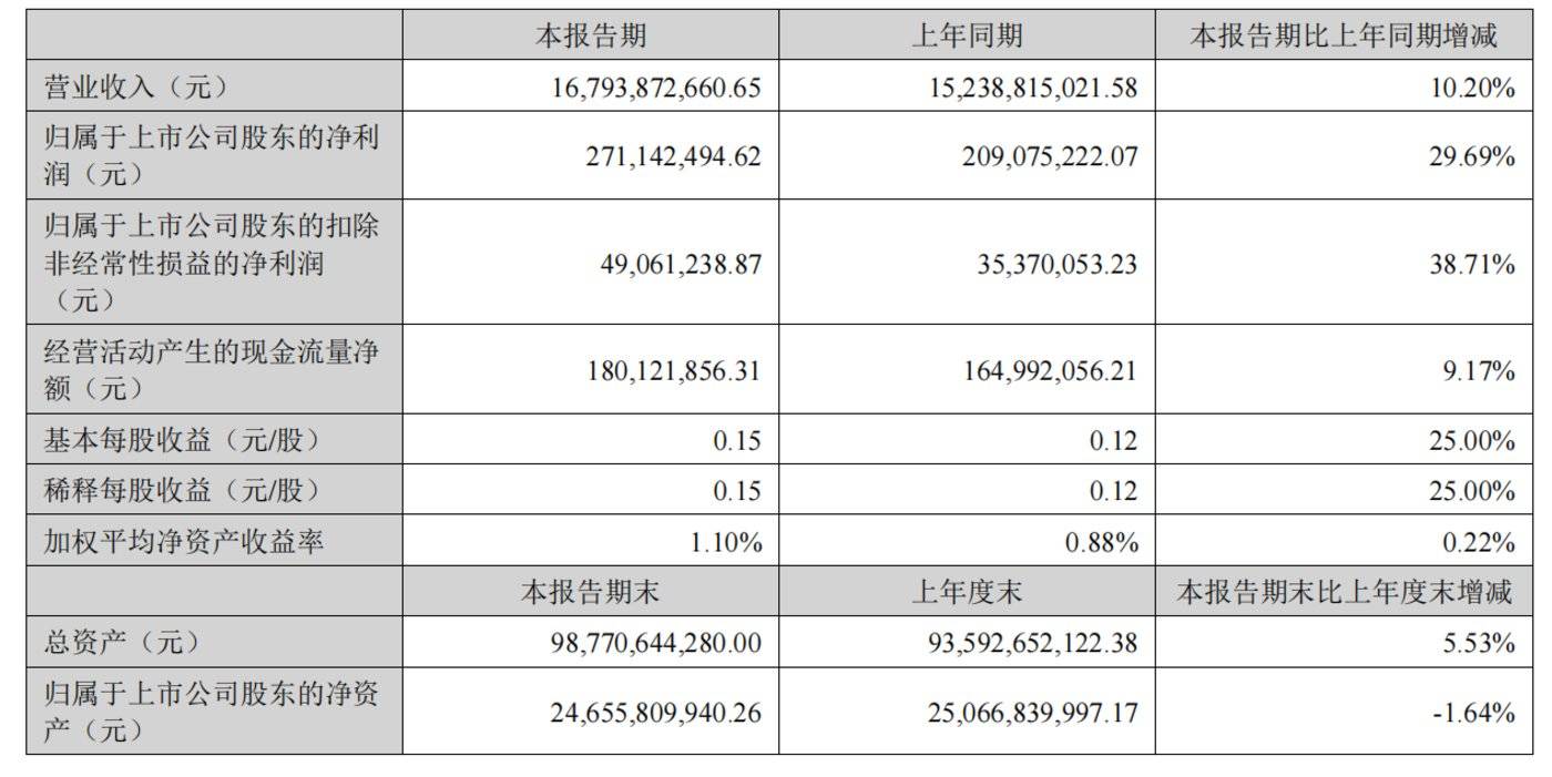 公司日前发布的 2024 年半年度报告显示,上半年,公司营业收入 167.9 亿元,同比增加 10.2%;归母净利润 2.71 亿元,同比增加 29.69%。