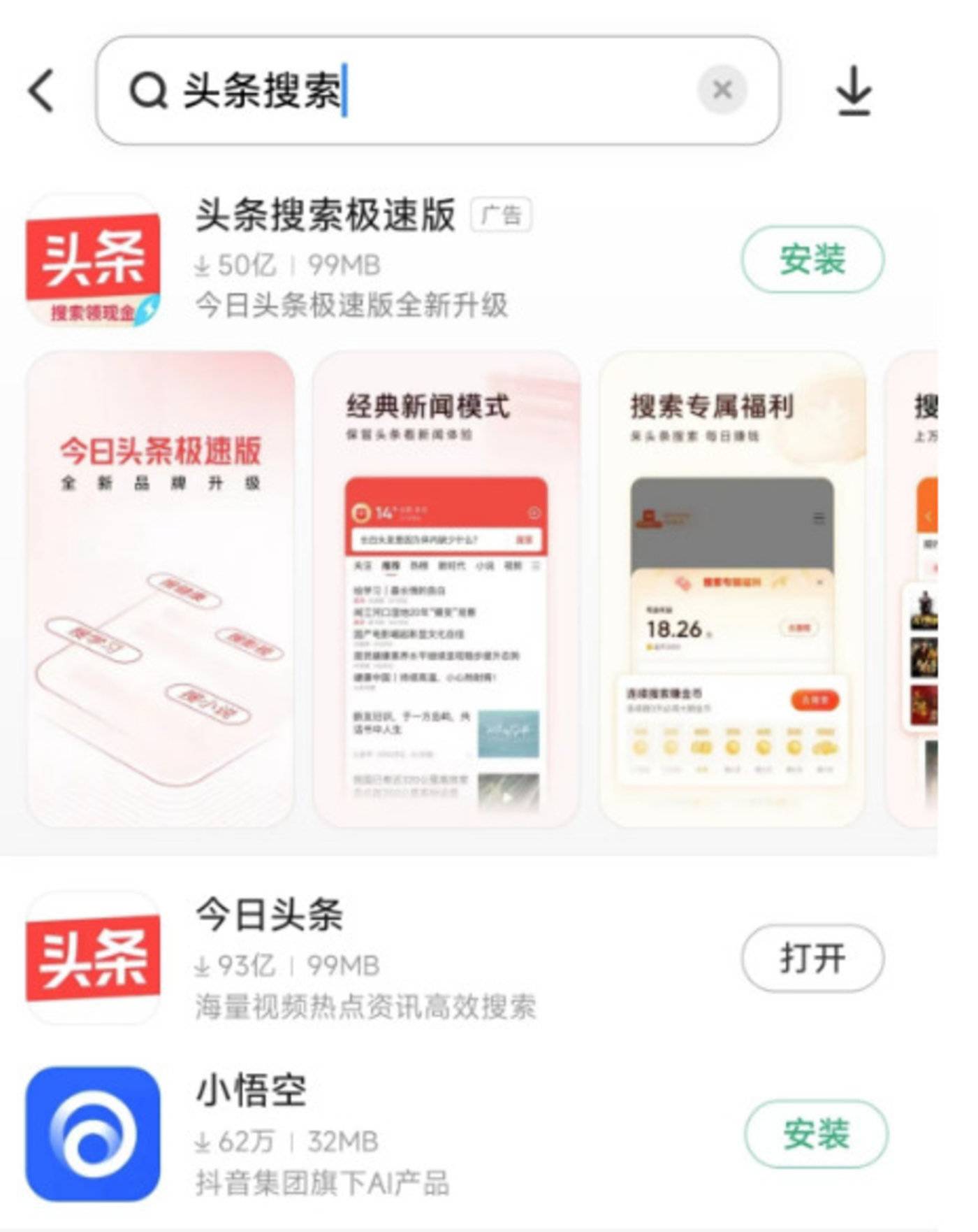 如今,在应用市场搜索的 「头条搜索」,实际上是 「今日头条极速版」;从今日头条中孵化出的悟空问答,在独立出来成为悟空搜索 APP 后,仅一年半时间,便更名 「小悟空」 转型成为 AI 工具库,和搜索再无关系。