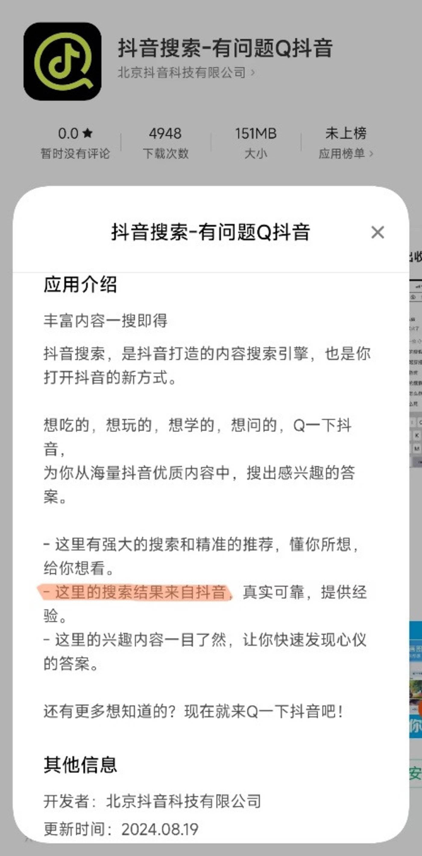 而在抖音搜索 APP 的应用介绍中也说明:「这里的搜索结果来自抖音」。这就意味着,抖音搜索仅是一个站内搜索引擎,更多地服务于抖音平台内的内容生态和用户需求。