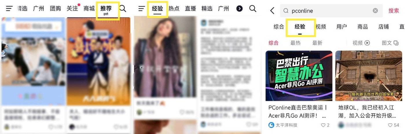 同时,当用户在站内进行关键词搜索时,也能从搜索结果顶部栏里,选择点击 「经验」,直接仅显示图文内容。