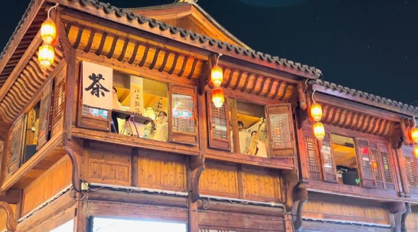 晚上 8 点,在江西鲲茶万寿宫店里,跟朋友出来旅游的晓玲,刚把自己捧着瓦罐浮梁雪山奶茶的照片发完朋友圈,就专注地欣赏鲲茶门店的汉服夜场演奏。到景区打卡一杯当地特色奶茶,已经是她旅游必备。