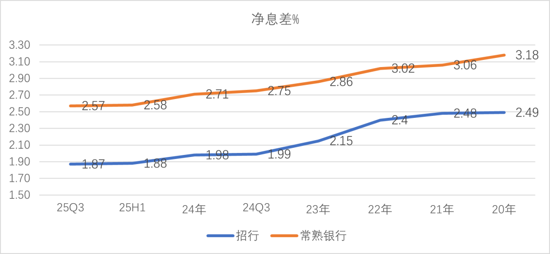 常熟银行以往的业务特色,是以“ 信贷工厂” 模式著称的小微金融。因此其净息差在 A 股上市银行中处于较高水平,2025 年三季度为 2.57%,较四大行约 1.3% 的净息差高出约 125 个基点。