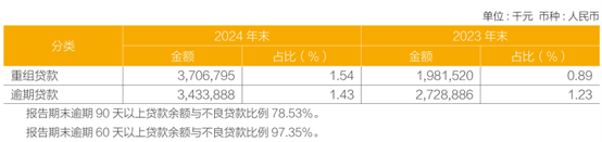 但从 2024 年年报披露的信息来看,常熟银行重组贷款占比 1.54%,逾期贷款占比 1.43%,重组加逾期贷款合计占比 2.97%,已高于不良加关注类贷款合计的 2.26%。