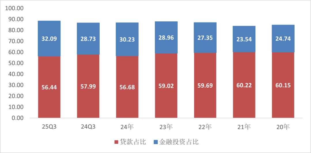 2025 年三季度净息差为 2.57%,较半年报下降 1 个基点。资产配置方面,63.84% 为信贷资产,26.61% 为金融投资。