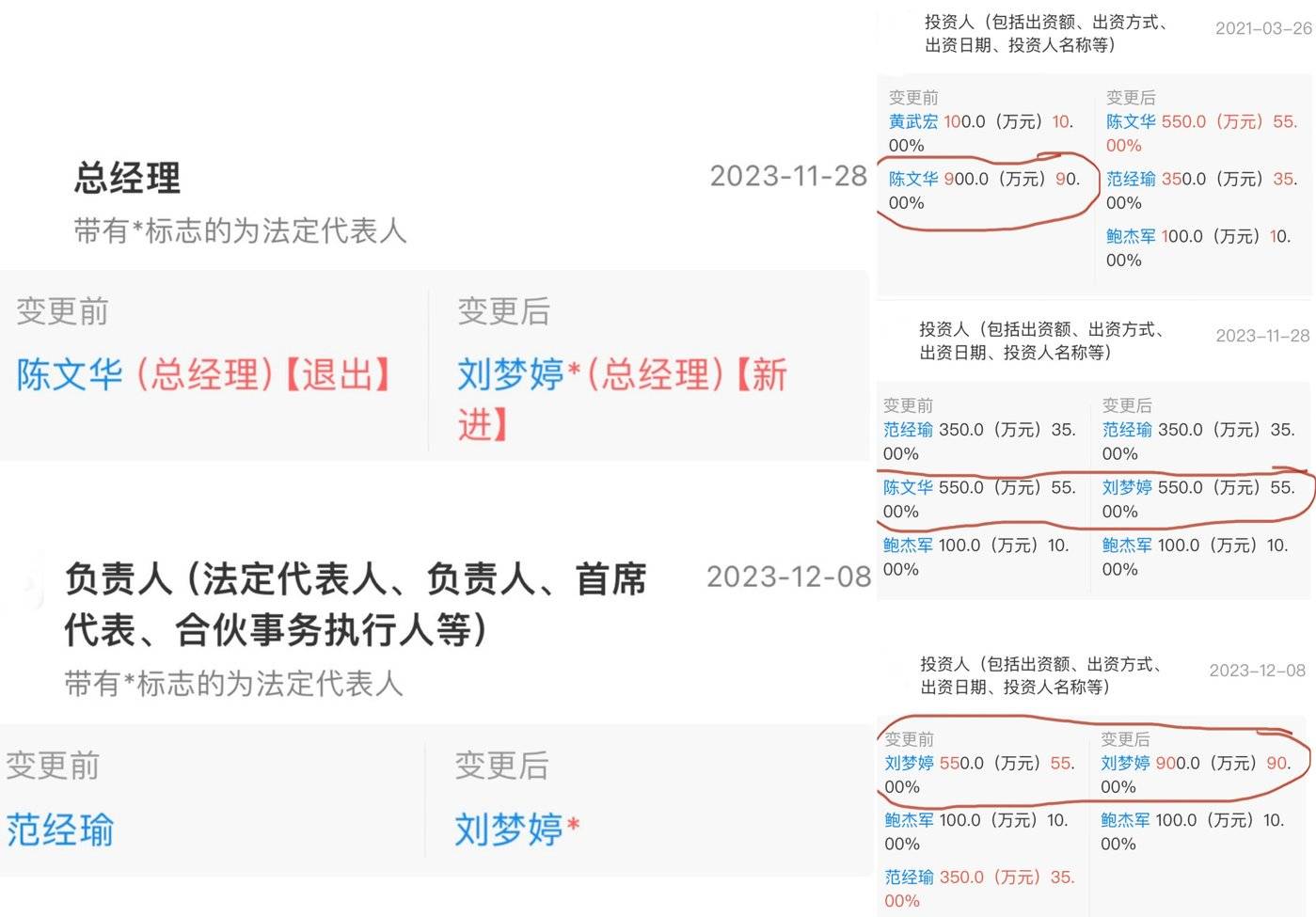 2023 年 11 月 28 日,即威创股份 13.3 亿被二次转走 (有去无回的那次) 的当月末,陈文平、范经瑜将自己在深圳博海的股权悉数转让、职务卸尽,深圳博海的大股东、法人摇身一变为自然人 「刘梦婷」。