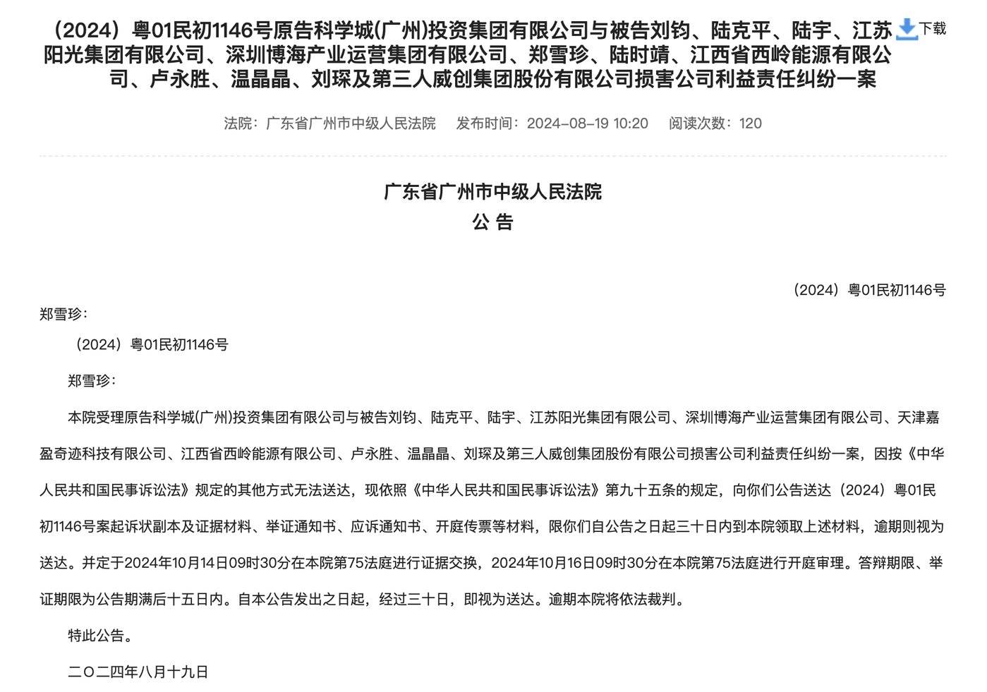 「科学城是 5 月来法院起诉,公安方面是在 7 月份,法院第一份公告发出之后,过来进行调查取证过。后来我们询问公安进展,得知大概是在 8 月 22 号左右吧应该已经立案,应该就差一个通知书。不过具体我们也在等他们 (警方) 最后通知。」 广州市中院工作人员称。