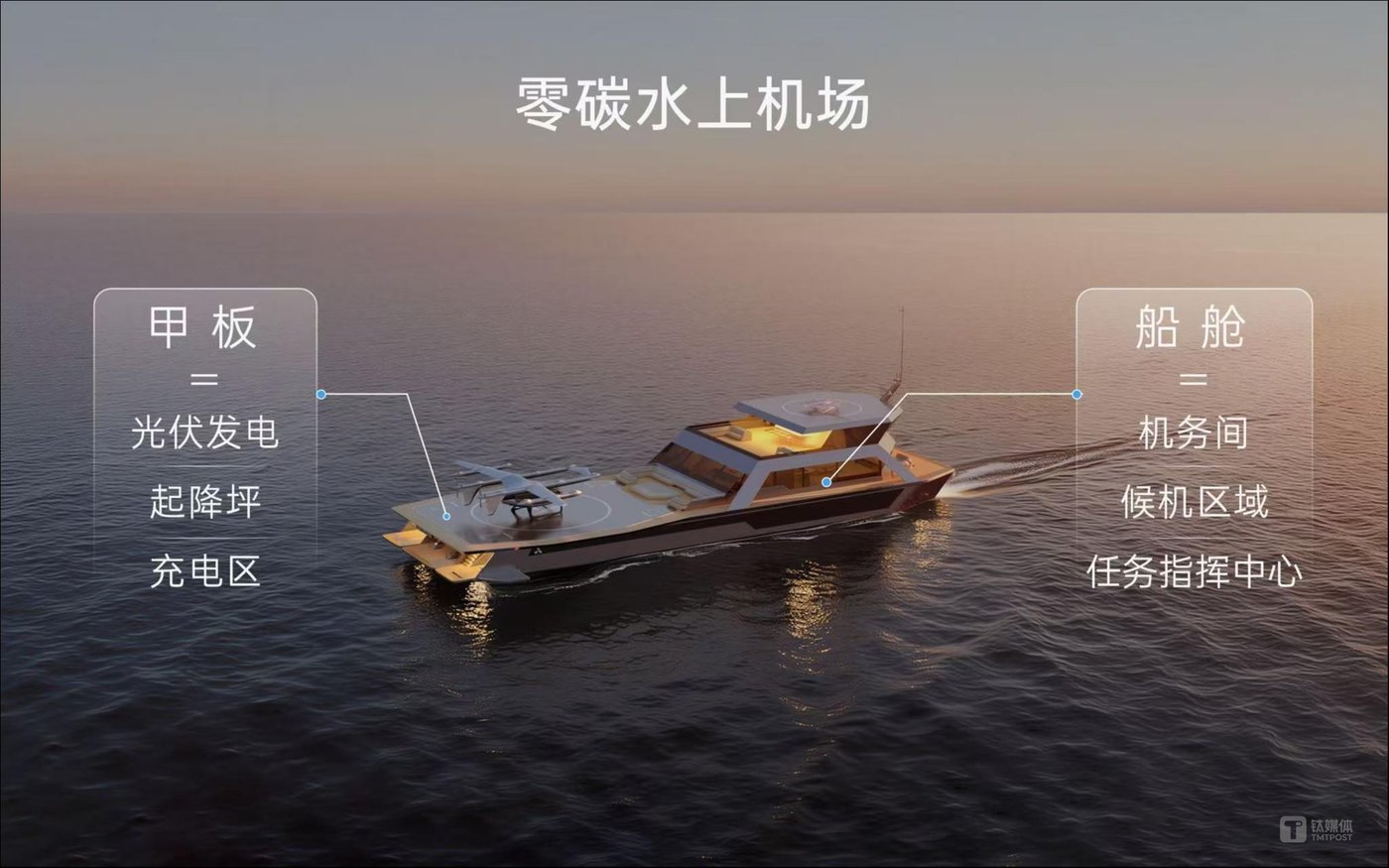 可灵活部署的零碳水上机场专为 eVTOL 航空器设计,采用纯电驱动,宽大的甲板作为起降平台,铺设光伏板,船舱则作为候机厅与机务室,不仅满足 eVTOL 起降及充电,还能与 eVTOL 共享数据,智能协同。