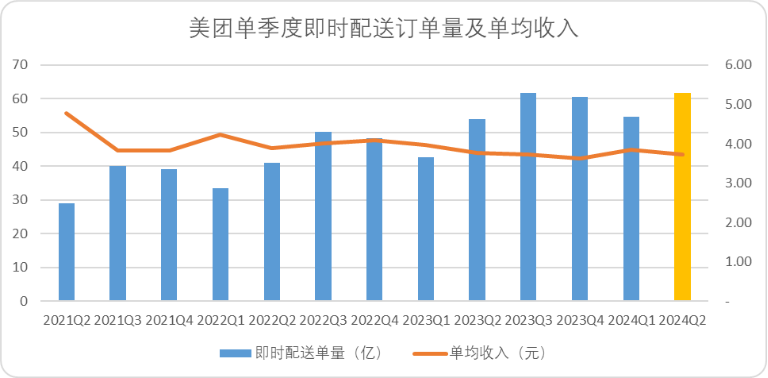 图:美团单季度配送订单及单均收入, 来源:企业财报,锦缎整理