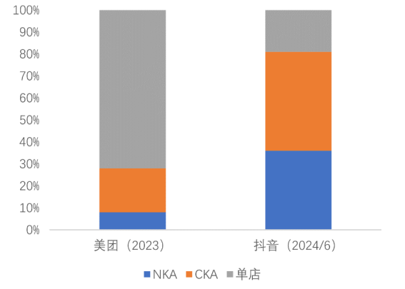 我们可以看到,供给侧结构端美团就具备先天的优势,根据东吴证券的统计,美团的单店商户占比远高于连锁,而抖音 NKA(大型连锁品牌) 和 CKA(区域连锁品牌) 更高。(当然美团的基数高很多,NKA 和 CKA 的绝对值与抖音差距不大)。