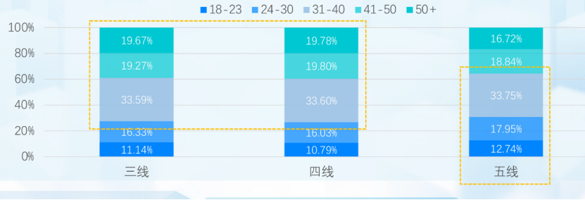 同时与印象不同的是,近年来低线城市人口结构变化也不容忽视。一方面高线城市人口回流,另一方面农村人口向上流向城镇,县域或低线城市的人口结构出现了明显变化。根据巨量城市研究院统计,抖音用户结构中,五线城市年龄结构更为年轻化,势必会带来更强的购买力增长动力。