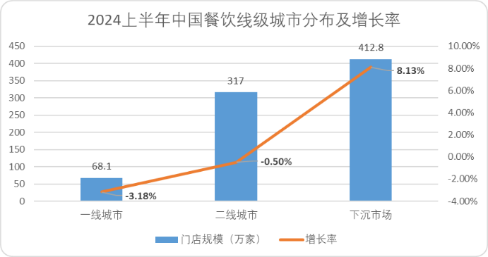 近两年那些前几年爆火的新消费品牌,上至火锅下至奶茶大大小小的餐饮新贵扎堆挤进了下沉市场,根据辰智大数据的统计,今年上半年下沉市场餐饮门店增速达到了 8.13%,与之相对应的一线及二线市场餐饮门店数量增速分别为-3.15% 和 0.5%