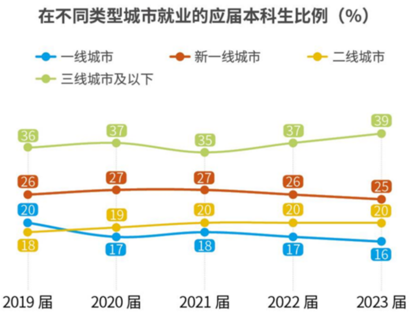图:应届生不同类型城市就业比例, 来源:麦克思研究院 《就业蓝皮书》